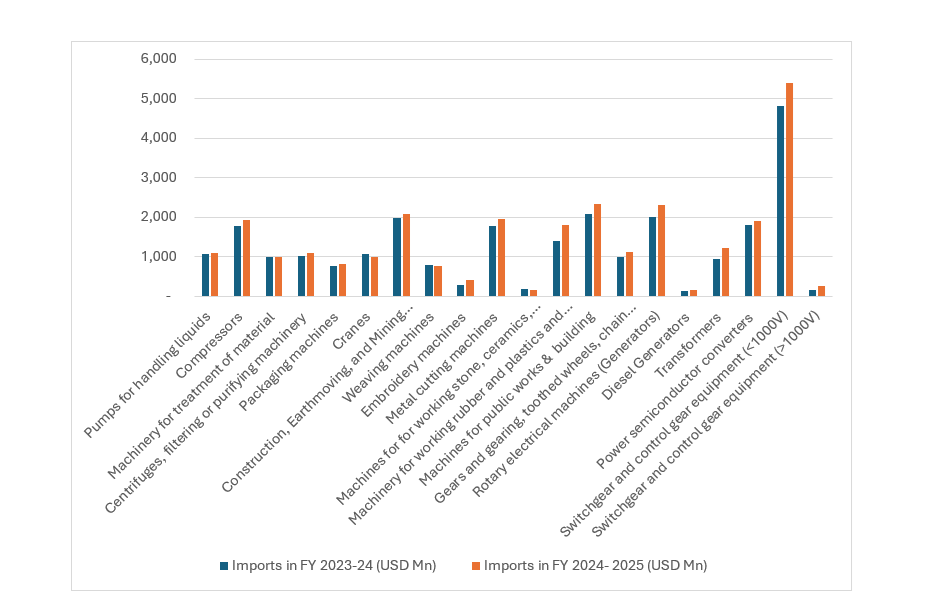 Switchgears rated below 1000 volts accounted for the highest import value, totaling USD 5.4 billion in FY 2024-25. Other categories with high imports into India during the same period include Rotary electrical machines (USD 2.30 billion), Machines for Public Works and Buildings (USD 2.35 billion), Construction, Earthmoving and Mining Machines (USD 2.07 billion), Metal Cutting Machines (USD 1.95 billion), Compressors (USD 1.94 billion), Power semiconductors convertors (USD 1.91 billion).