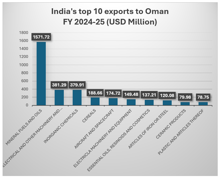 India’s principal exports to Oman are mineral fuels and oils , inorganic chemicals , machinery , cereals , aircraft and spacecraft.