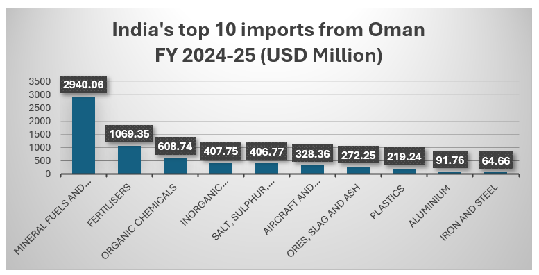 India’s principal imports from Oman are mineral fuels and oils, fertilisers , organic chemicals , inorganic chemicals, salt , and aircraft and spacecraft.